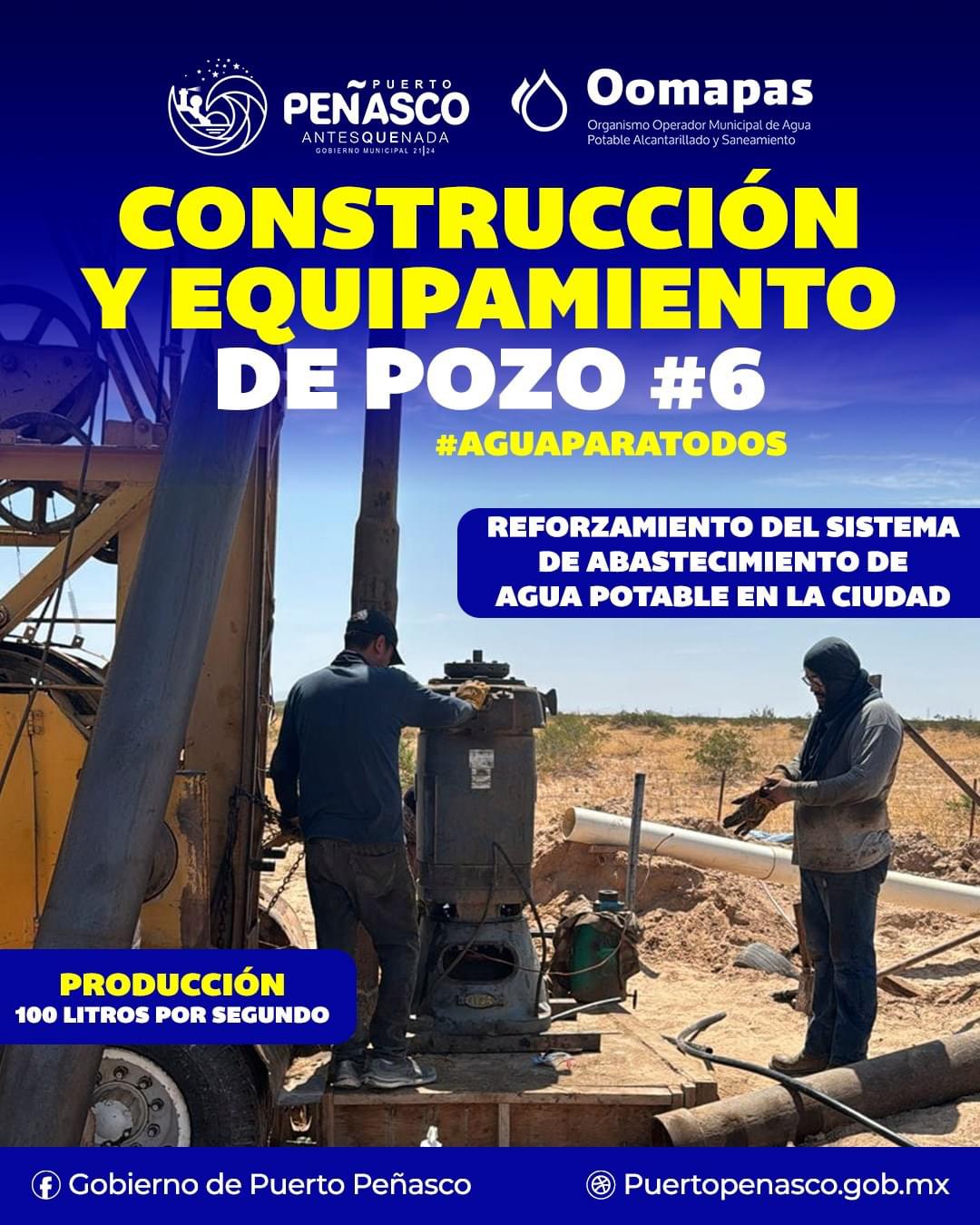 Con la construcción y el equipamiento del pozo #6 ubicado en el ejido Agua Zarca se logra suministrar 100 litros por segundo adicionales a la red principal de agua potable reforzando el abastecimiento del vital líquido en la ciudad.