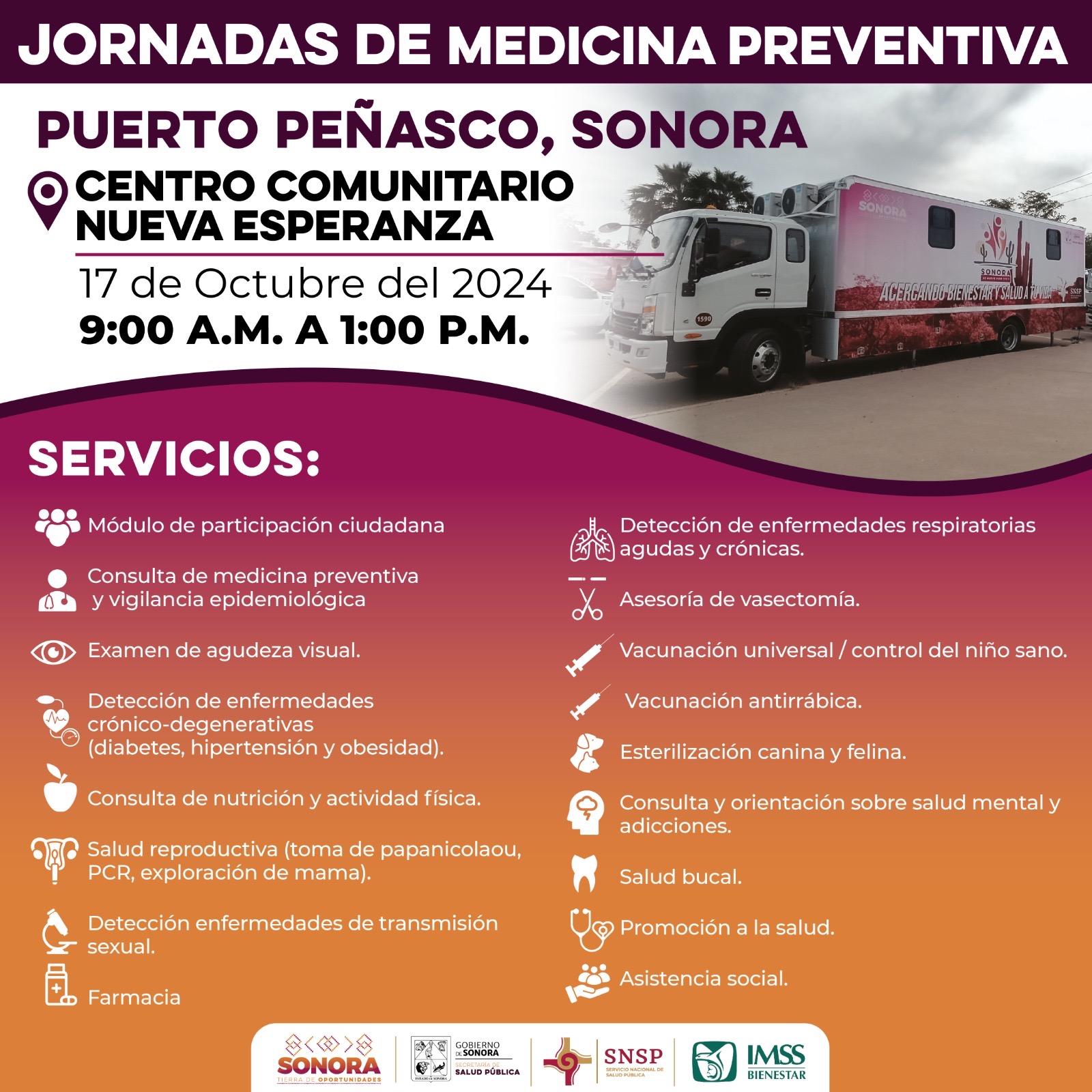 El Gobierno Municipal de Puerto Peñasco se complace en anunciar la llegada de las Clínicas Móviles de Medicina Preventiva, un importante esfuerzo del Gobierno de Sonora en Coordinación con Gobierno Municipal busca brindar servicios de salud pública a las comunidades con mayor rezago social.