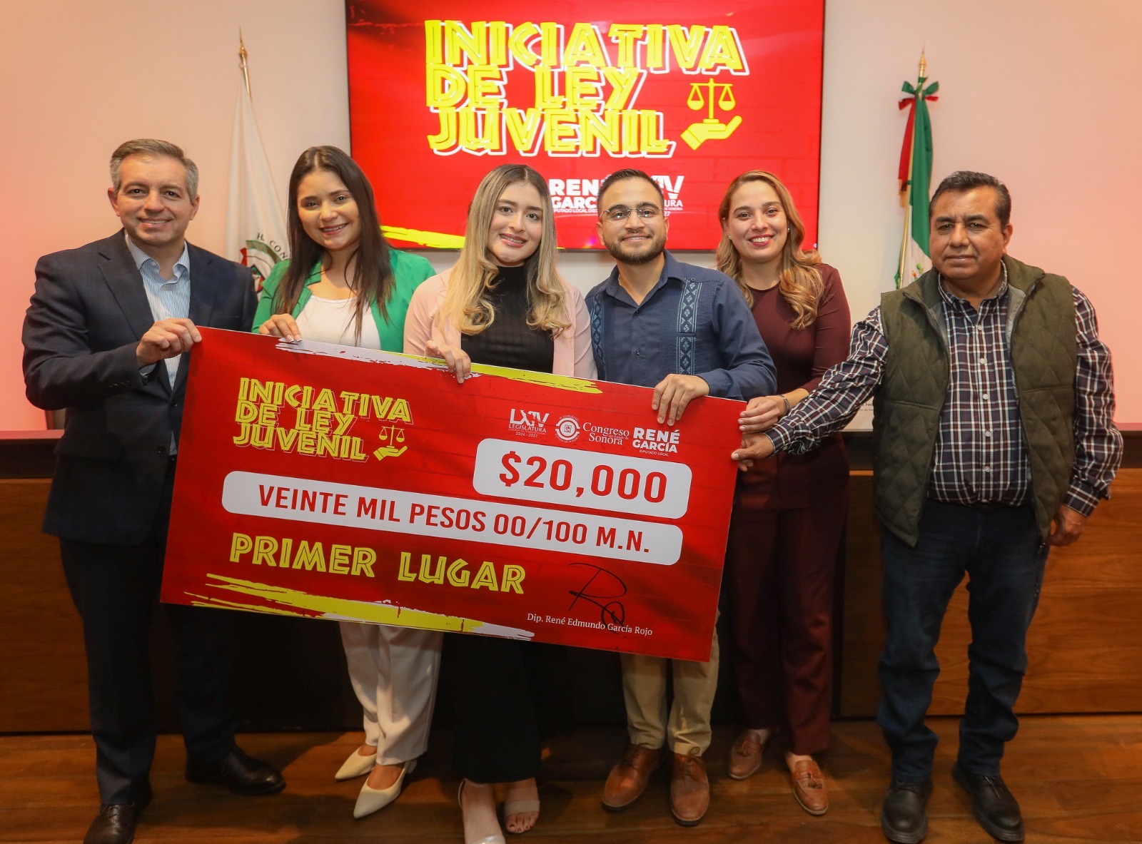 Hermosillo, Sonora; 11 de diciembre de 2024.- El diputado René Edmundo García Rojo (PT) premió a Eliana Paola Búrquez Vega; Francisco Javier Higuera Orduño y Víctor Alberto Cuevas Acosta, ganadores del primero, segundo y tercer lugar, respectivamente, del concurso “Iniciativa de Ley Juvenil 2024”.