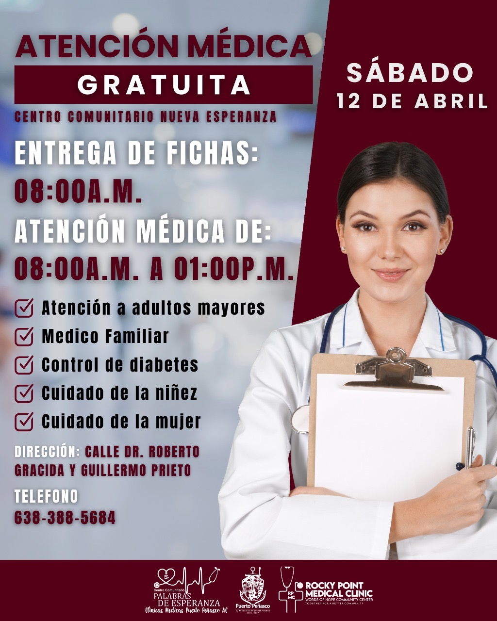 El Gobierno Municipal de Puerto Peñasco, a través del Centro Comunitario Nueva Esperanza, en coordinación con Rocky Point Medical Clinic y el Centro Comunitario Palabras de Esperanza, invita cordialmente a toda la comunidad a la jornada de salud: atención médica gratuita.