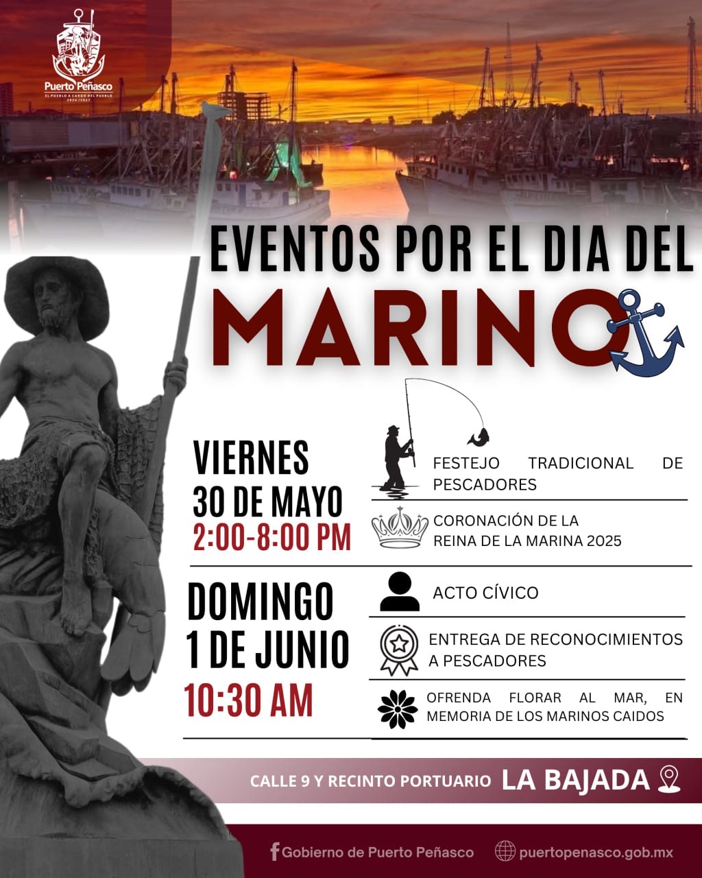 El Gobierno Municipal de Puerto Peñasco tiene el honor de invitar a toda la ciudadanía a los festejos conmemorativos por el Día del Marino, que se llevarán a cabo los días 30 de mayo y 1 de junio en la Calle 9, recinto portuario, en el área conocida como La Bajada de embarcaciones menores.