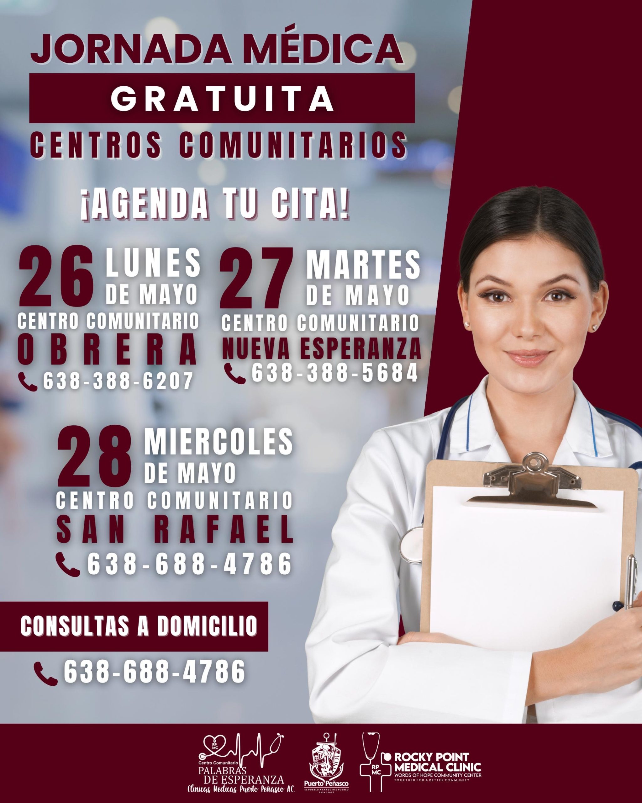 El Gobierno Municipal de Puerto Peñasco, en coordinación con Rocky Point Medical Clinic y el Centro Comunitario Palabras de Esperanza, invita cordialmente a toda la comunidad a la jornada de salud: atención médica gratuita.