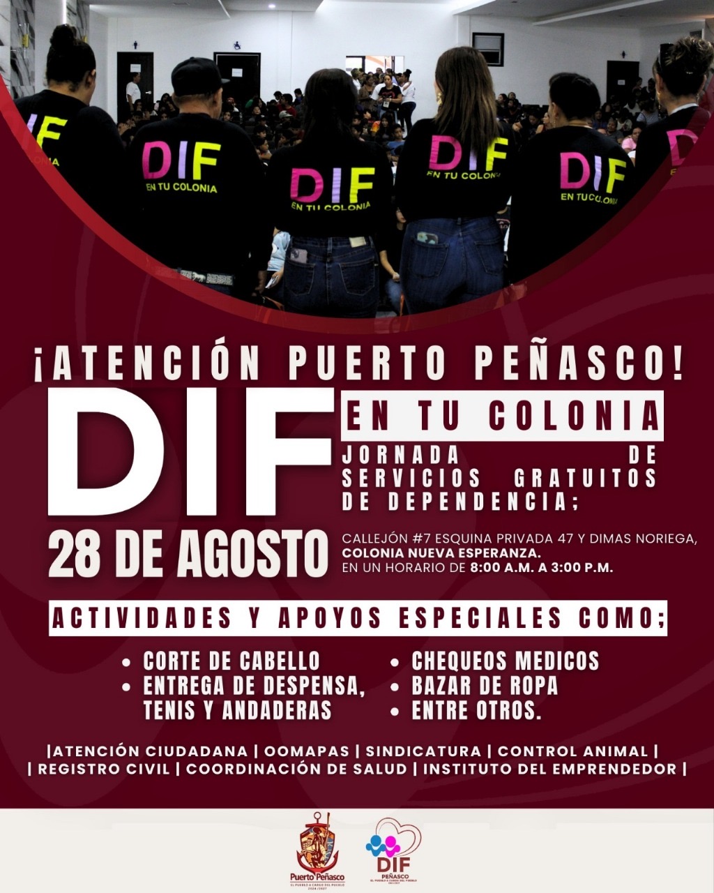 El Gobierno Municipal de Puerto Peñasco, a través del Sistema DIF Municipal, invita a las y los ciudadanos a participar en la jornada de servicios “DIF en tu colonia”, que se llevará a cabo el próximo 28 de agosto, en Callejón #7 esquina Privada 47 y Dimas Noriega, Colonia Nueva Esperanza, en un horario de 8:00 a.m. a 3:00 p.m.