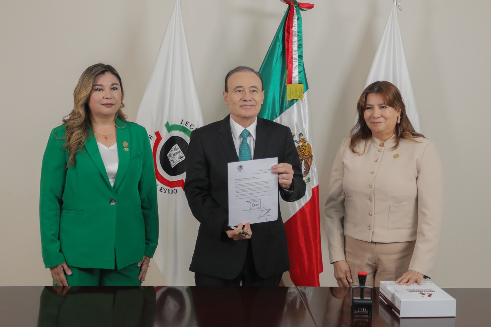 En compañía de la diputada Jazmín Guadalupe Gómez Lizárraga (PT), presidenta de la Comisión de Régimen Interno y Concertación Política (Cricp), la diputada presidenta destacó que la entrega del informe se realiza en cumplimiento de los artículos 46 y 79, fracción octava, de la Constitución local, y subrayó que el congreso lo analizará con responsabilidad y atención.