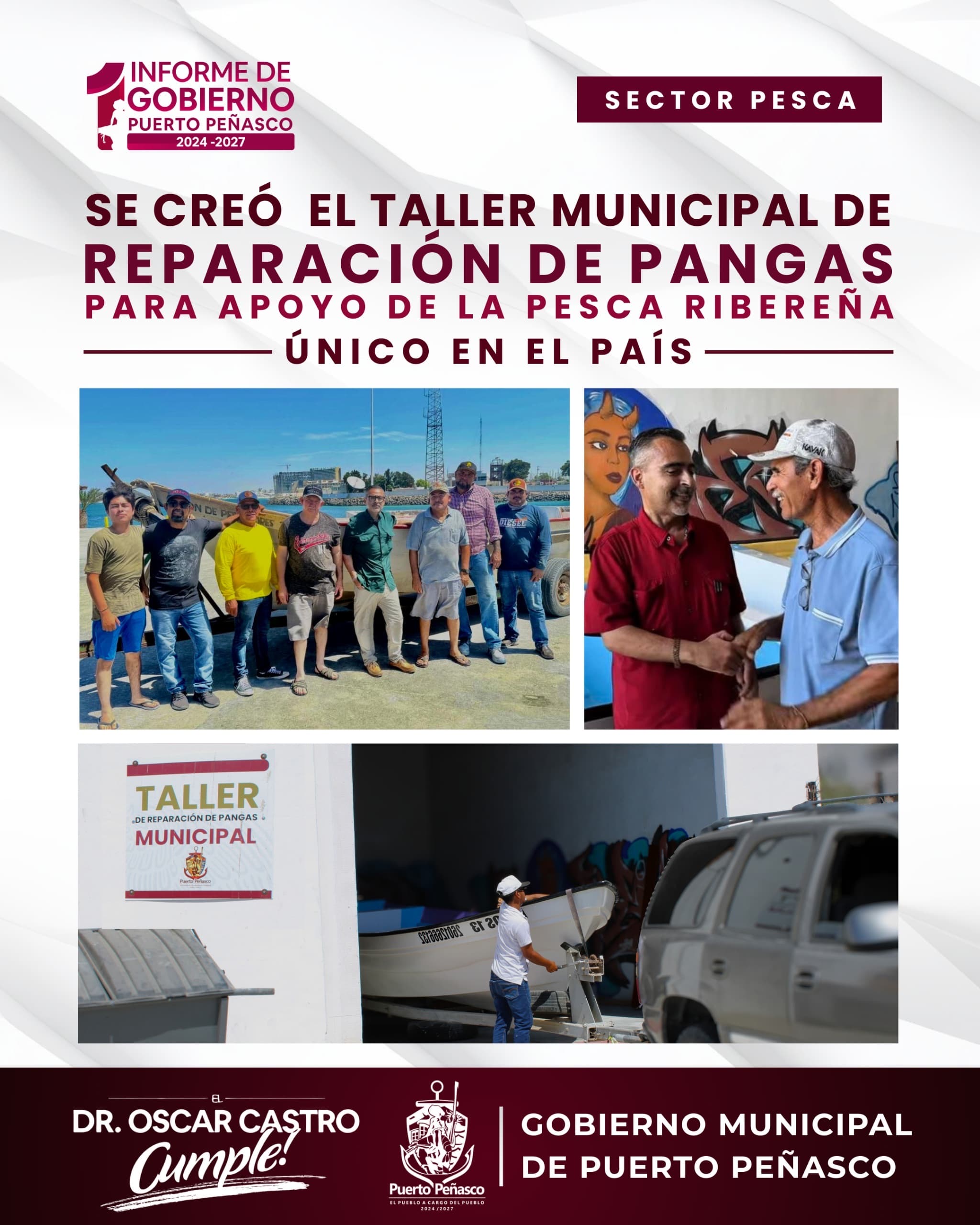 En cumplimiento con el compromiso asumido por el presidente municipal, Dr. Óscar Eduardo Castro Castro, con el sector pesquero, el Gobierno de Puerto Peñasco puso en marcha el Taller Municipal de Reparación de Pangas. Este programa único en el país tiene como objetivo apoyar a los pescadores de ribera en el mantenimiento de su principal herramienta de trabajo, fortaleciendo así una de las actividades productivas más importantes de nuestra comunidad.