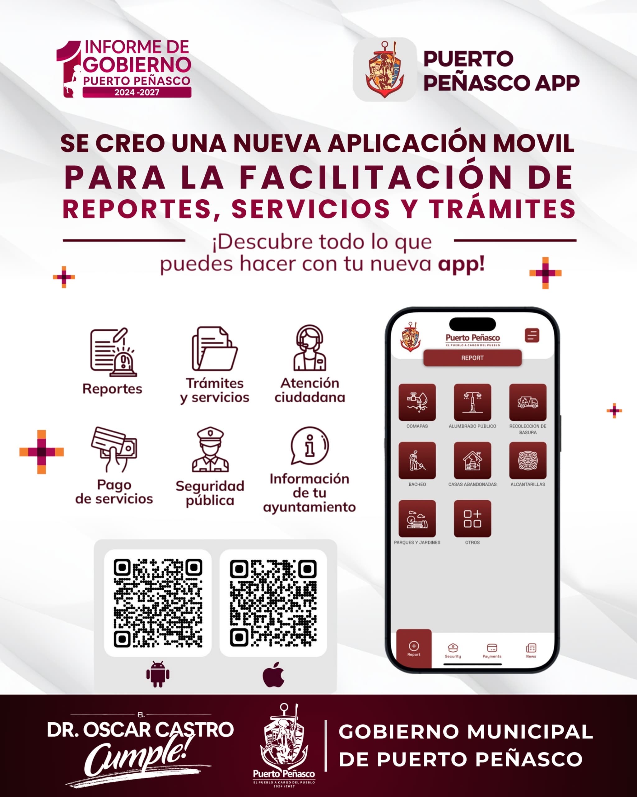 Se puso a disposición de la ciudadanía la nueva aplicación móvil Puerto Peñasco App, una herramienta innovadora que facilita reportes, trámites y servicios desde cualquier lugar. Con esta plataforma digital podrás acceder de manera rápida y sencilla a información de tu ayuntamiento, realizar pagos de servicios, contactar atención ciudadana y mantenerte informado sobre seguridad pública. Un compromiso más para acercar el gobierno a la gente y mejorar la calidad de vida de todas y todos los peñasquenses.