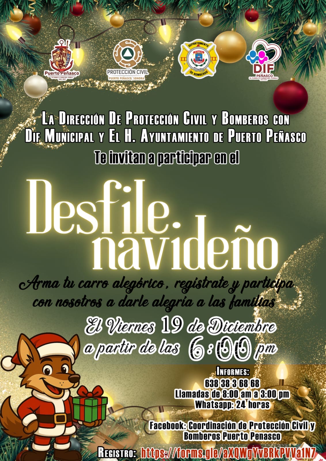 El Gobierno de Puerto Peñasco, a través de la Dirección de Protección Civil y Bomberos en coordinación con el DIF Municipal, invita a toda la comunidad a participar en el tradicional Desfile Navideño 2025, que se llevará a cabo el viernes 19 de diciembre a partir de las 6:00 p.m.