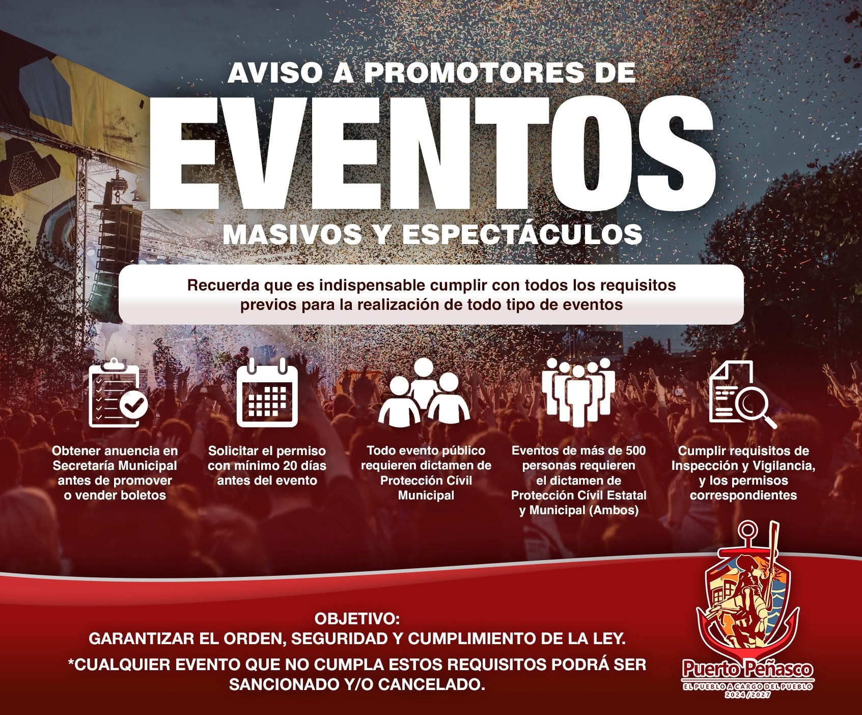 El Gobierno Municipal de Puerto Peñasco hace de nuevo un exhorto a los promotores y organizadores de eventos especiales y masivos para cumplir con los requisitos establecidos, antes de iniciar cualquier promoción, venta de boletos o difusión en redes sociales, y con esto evitar sanciones y/o la cancelación del evento.