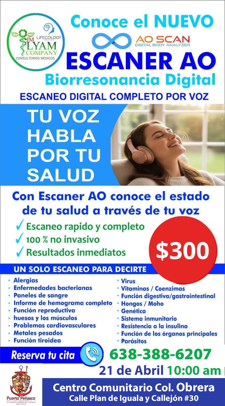 El Gobierno Municipal de Puerto Peñasco y el Centro Comunitario Colonia Obrera invitan a la ciudadanía a aprovechar el servicio de escaneo de salud con tecnología de Escáner AO, Biorresonancia Digital, una alternativa innovadora para conocer el estado general del organismo de manera rápida y no invasiva.